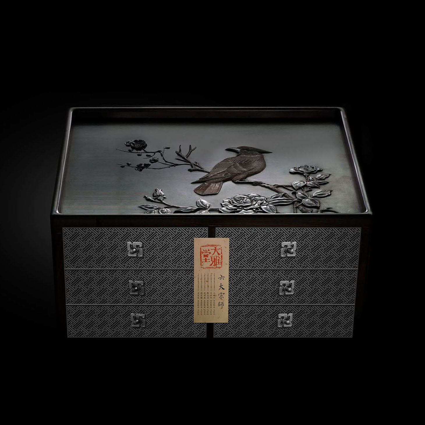 Made of Bois de Rose (Dalbergia louvelii), this tea caddy has a neat rectangular shape supported by four legs. Its frame and border are plain without decorations. On the top surface, there is a relief carving of a hoopoe perching on a branch—with delicate bird feathers, plump blooming flowers, and stretched branches and leaves. The vertical sides are fully covered with uniform and fine "Wan" (eternity) patterns arranged in a flowing style. The caddy is divided into six drawers, three on each side; each drawer is equipped with a knob engraved with the "Wan" pattern. The consistent patterns endow the caddy with an extraordinary artistic temperament.