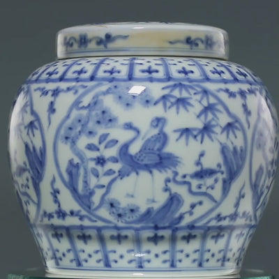 连鹤同窗青花茶叶罐:口直径:8.7cm,高:13..5cm,腹径:14.5cm;